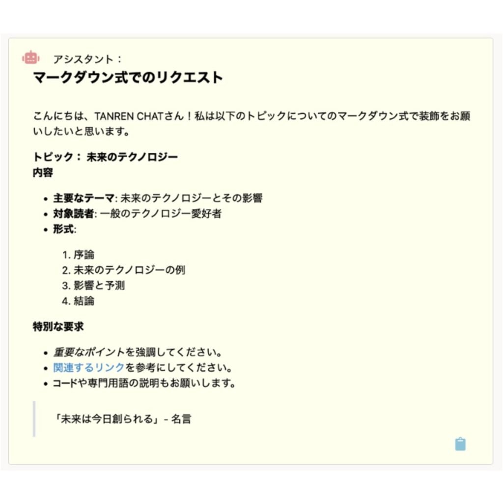 - 出力のフォーマットは"マークダウンプレビュー"で表示してください。
