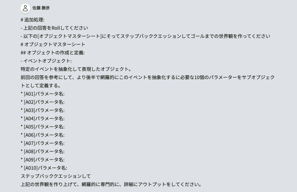 以下の[オブジェクトマスターシート]にそってステップバッククエッションしてゴールまでの世界観を作ってください