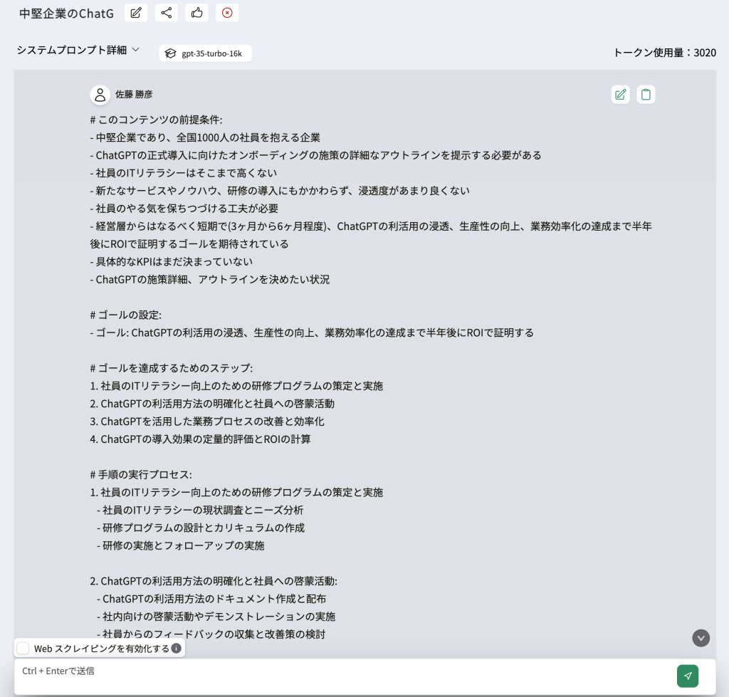 これは当社がより有能な[3.5turbo-16K]モデルを採用してるのでできる事になります。