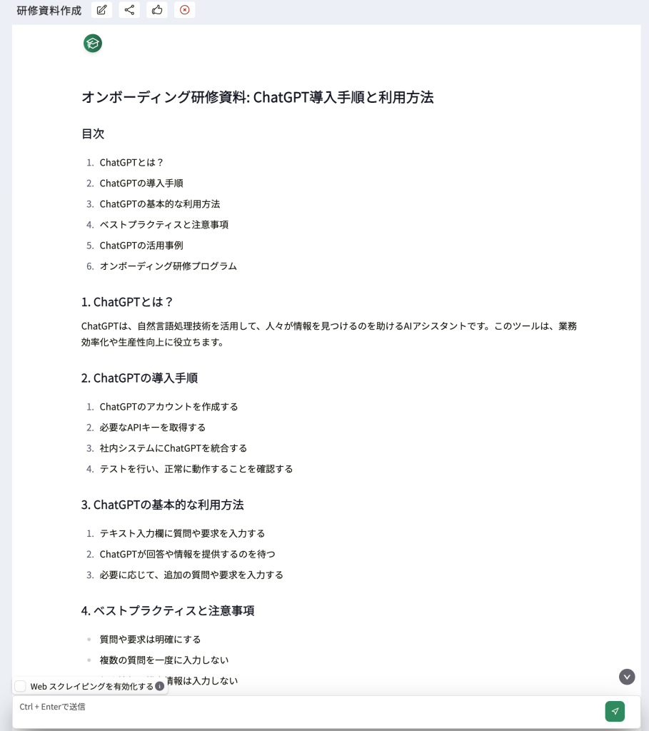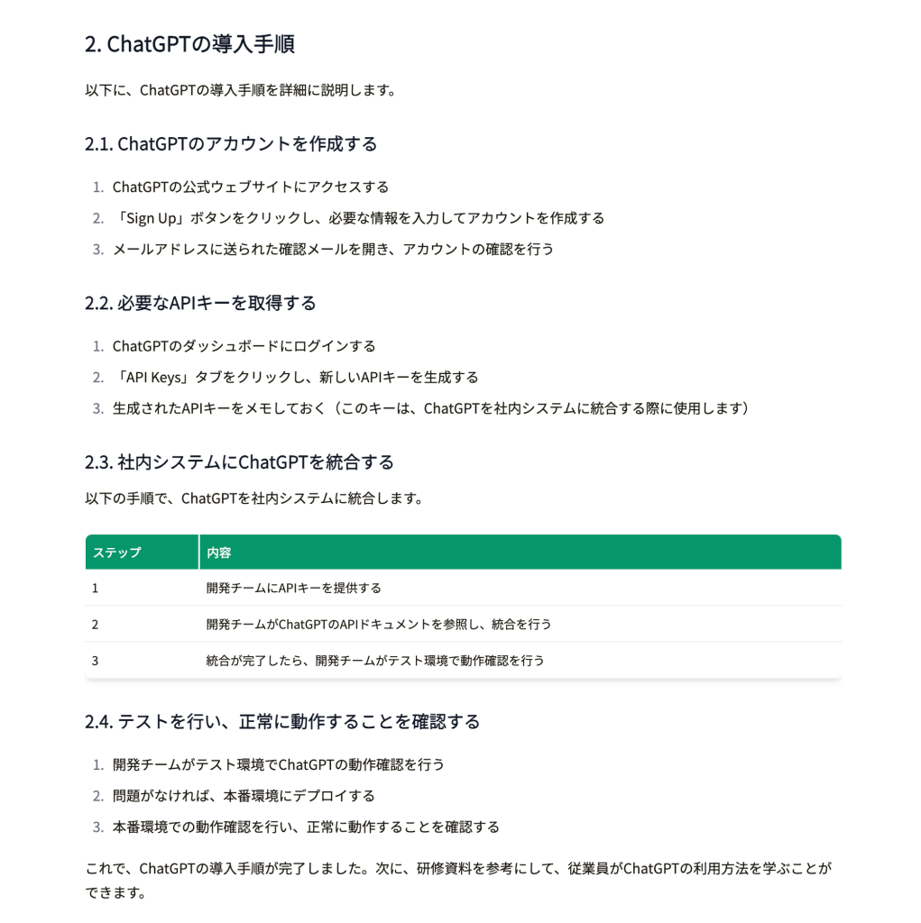 これで、ChatGPTの導入手順が完了しました。次に、研修資料を参考にして、従業員がChatGPTの利用方法を学ぶことができます。