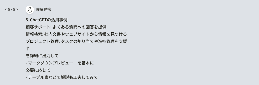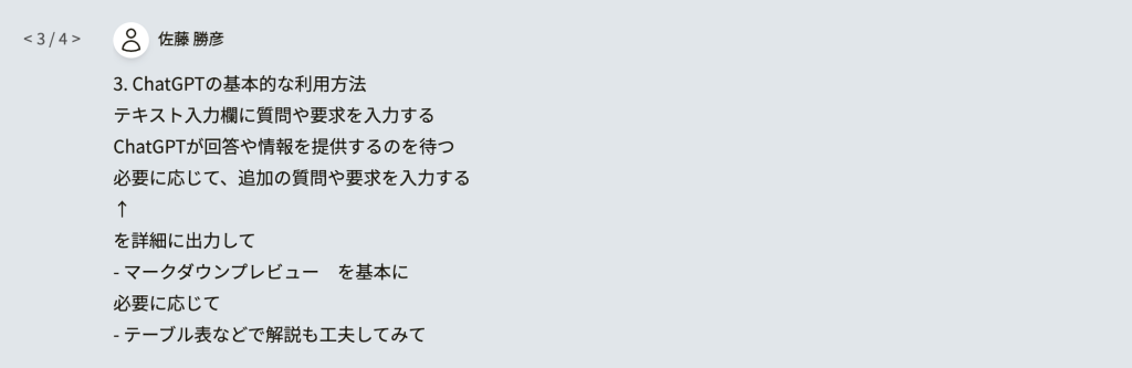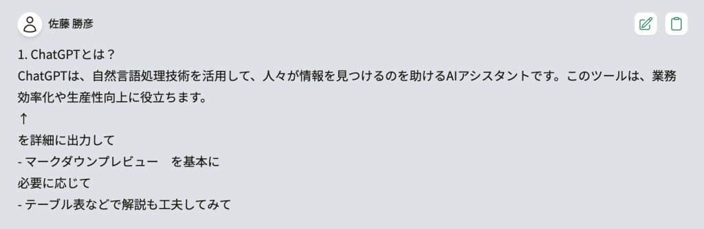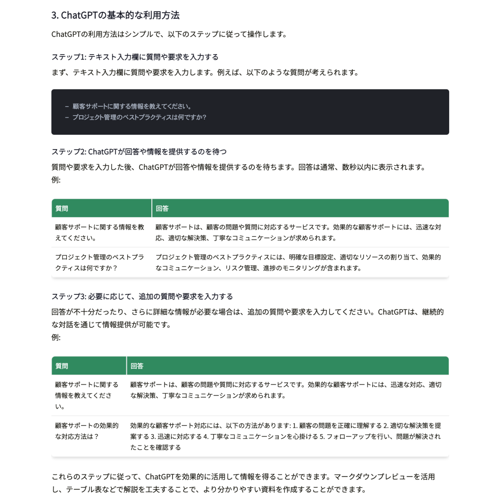 これらのステップに従って、ChatGPTを効果的に活用して情報を得ることができます。マークダウンプレビューを活用し、テーブル表などで解説を工夫することで、より分かりやすい資料を作成することができます。