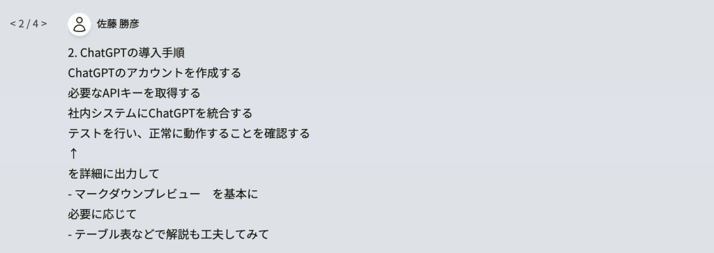 | 2 | 開発チームがChatGPTのAPIドキュメントを参照し、統合を行う |