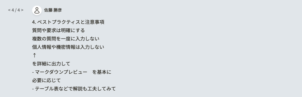 | 質問や要求は明確にする | 簡潔かつ具体的な表現で質問や要求を伝えることで、ChatGPTが正確な回答を提供しやすくなります。 |