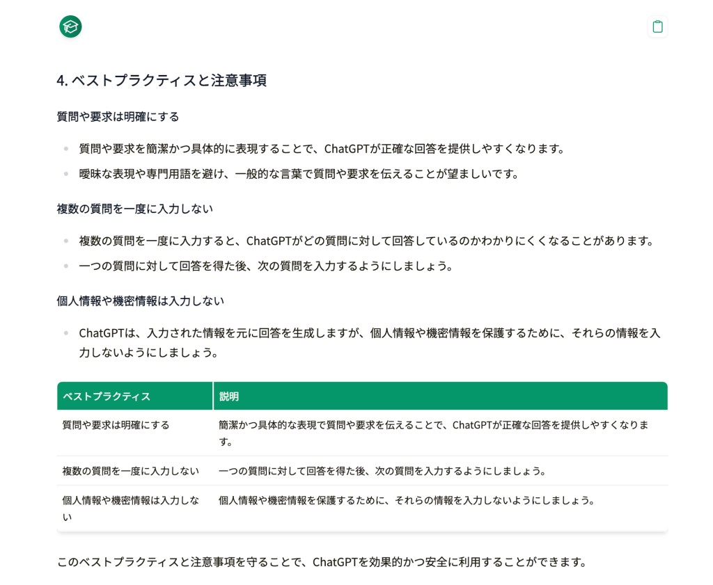 このベストプラクティスと注意事項を守ることで、ChatGPTを効果的かつ安全に利用することができます。