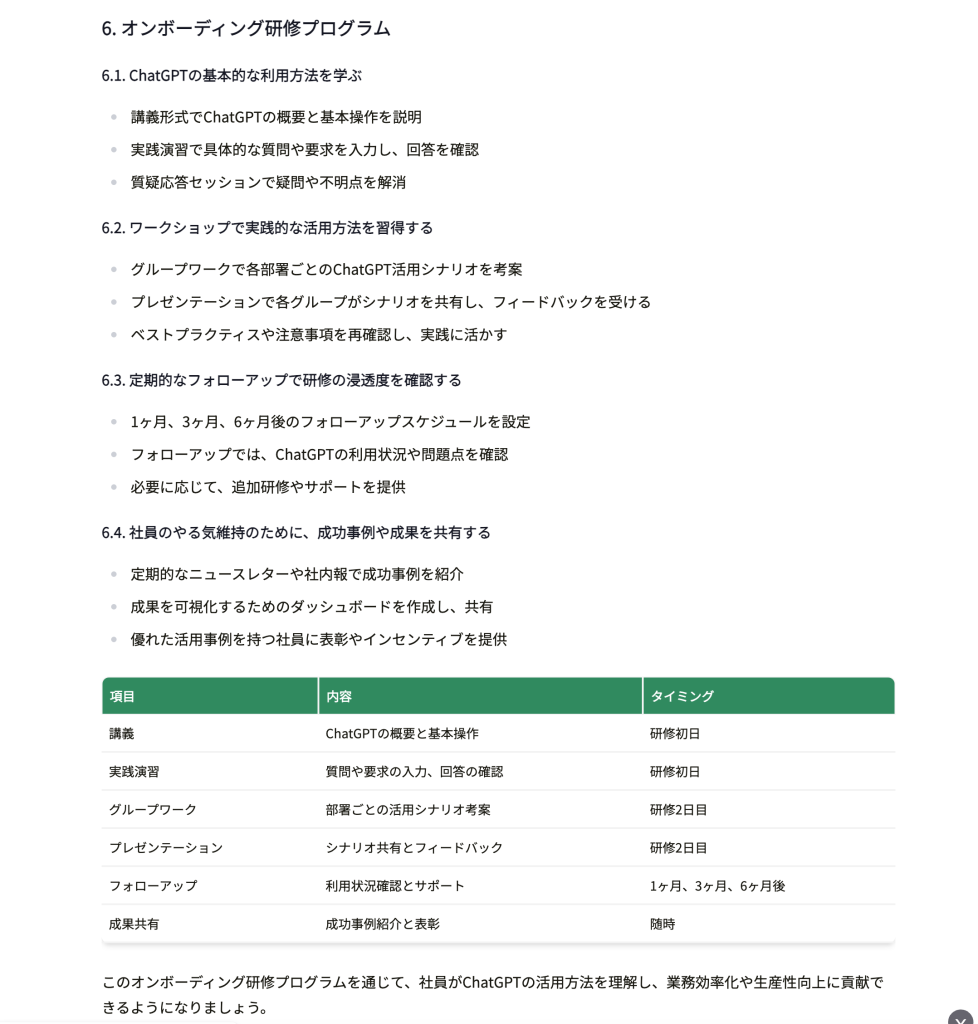 このオンボーディング研修プログラムを通じて、社員がChatGPTの活用方法を理解し、業務効率化や生産性向上に貢献できるようになりましょう。
